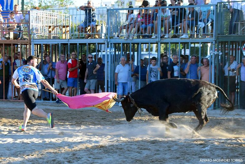 12:00 h. Inauguración del Baret dels Bous, suelta de vacas, toro y novillo de la ganadería Els Coves de Pedreguer; en el recinto taurino de la avenida Palmela.