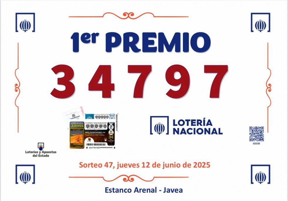 La suerte ha vuelto a sonreir a Xàbia en el 47 sorteo de la Lotería Nacional celebrado este jueves 12 de junio. El número 34.797, agraciado con el primer premio, ha sido vendido parcialmente en el municipio, concretamente en la expendeduría de Tabacos Arenal.