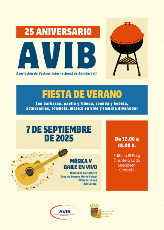 La Asociación de Vecinos Internacional de Benitachell (AVIB) conmemora este año el 25 aniversario de su fundación con una gran fiesta de fin de verano que contará con la colaboración del Ayuntamiento de El Poble Nou de Benitatxell.