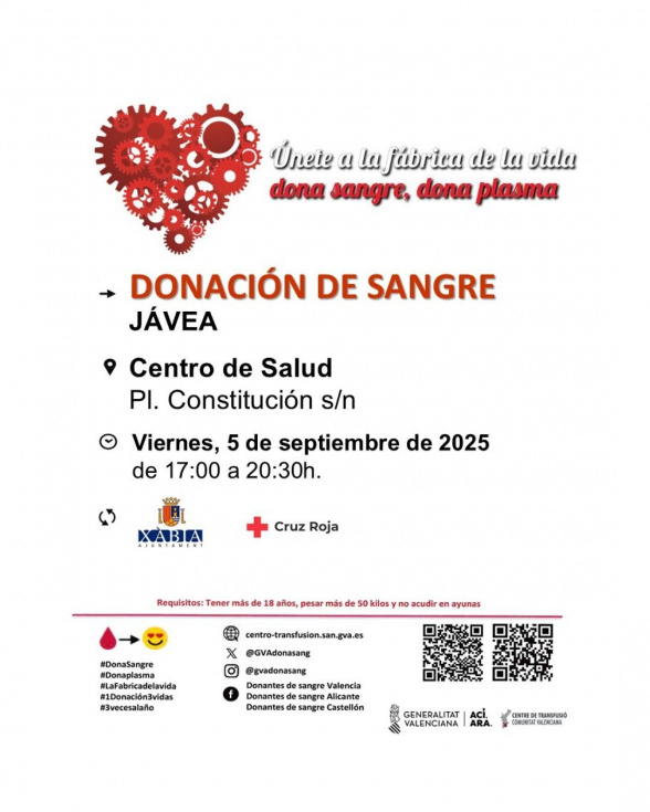La localidad de Xàbia será una de las paradas de la campaña de donación organizada por el Centro de Transfusión de la Comunitat Valenciana durante la semana del 1 al 7 de septiembre de 2025. La cita está programada para el viernes 5 de septiembre de 2025 en el Centro de Salud, situado en la Plaza Constitución, s/n, en horario de 17:00 a 20:30 horas.