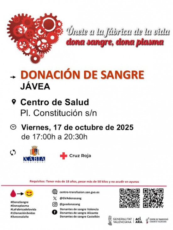 El municipio de Xàbia participará una vez más en la campaña comarcal de donación de sangre organizada por el Centro de Transfusión de la Comunitat Valenciana, que recorrerá distintas localidades de la Marina Alta durante la semana del 10 al 17 de octubre de 2025.
